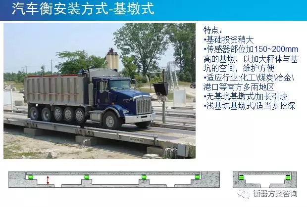 基墩式一般是在無(wú)基坑或淺基坑的基礎(chǔ)上再增加200~300mm的基墩,方便清理,多用于一些經(jīng)常掉落雜物和顆粒的場(chǎng)合,方便清掃,防止秤臺(tái)被硬物卡住影響稱(chēng)量精度。